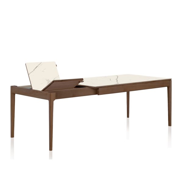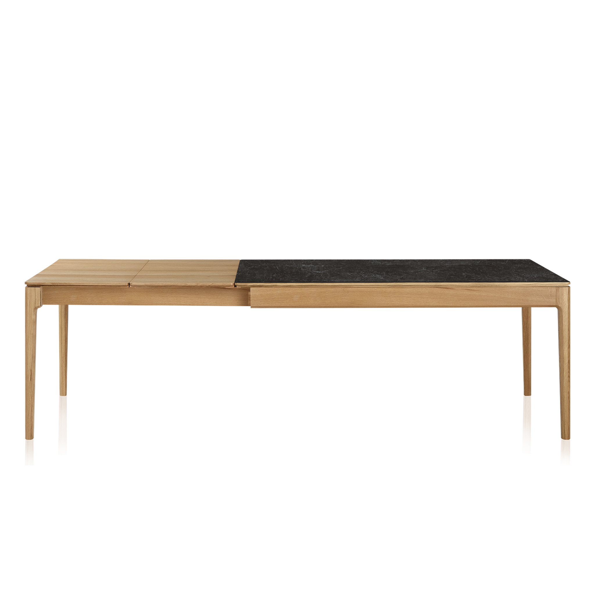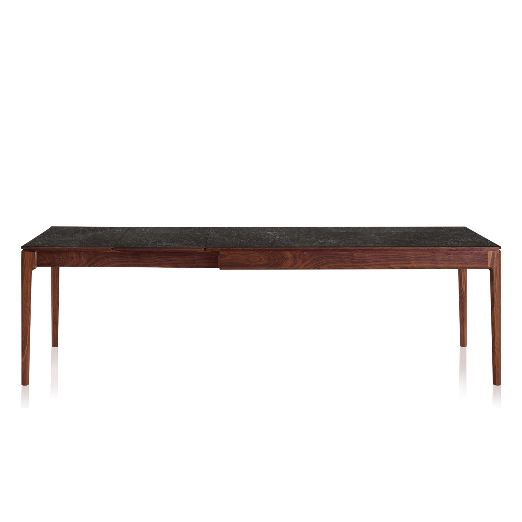 Ceramic top: 3 mm ceramic slab glued to 19 mm MDF with solid wood brackets. Portfolio” extensions in the same construction principle as the tabletop. Aluminum runners at the end of the table provide a total extension of 100 cm.
