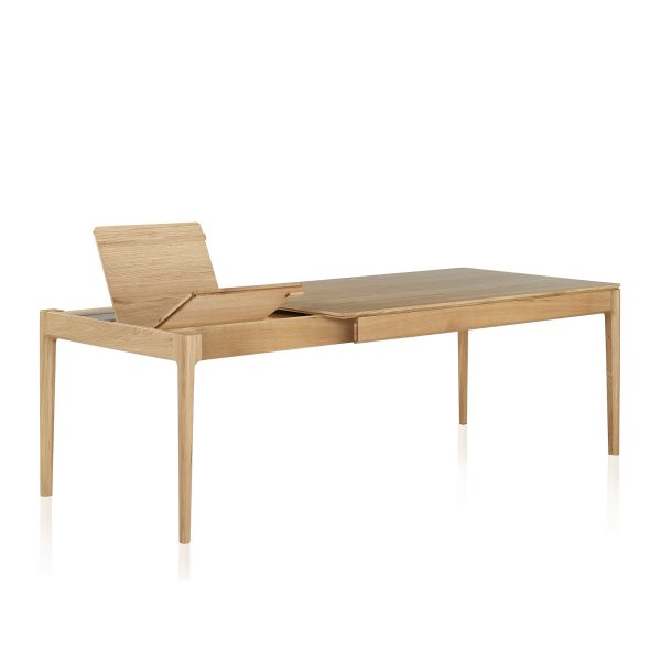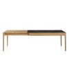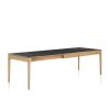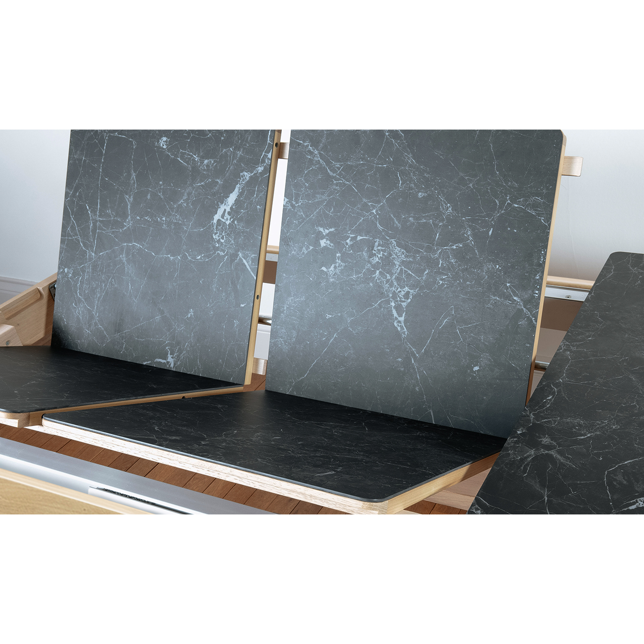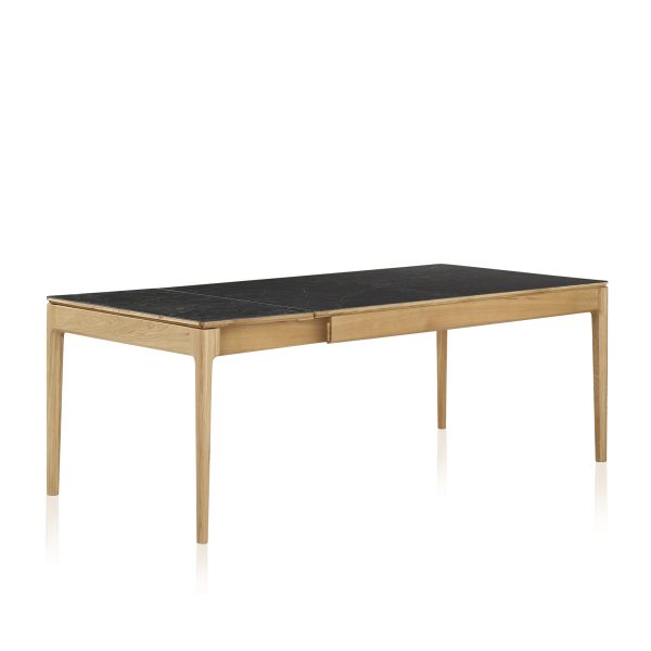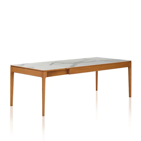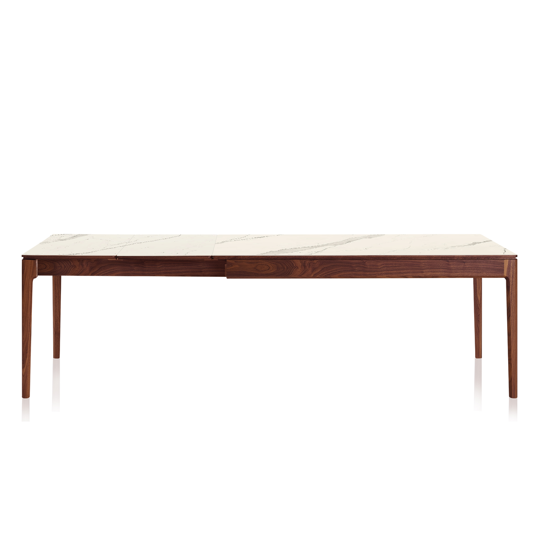 Ceramic top: 3 mm ceramic slab glued to 19 mm MDF with solid wood brackets. Portfolio” extensions in the same construction principle as the tabletop. Aluminum runners at the end of the table provide a total extension of 100 cm.