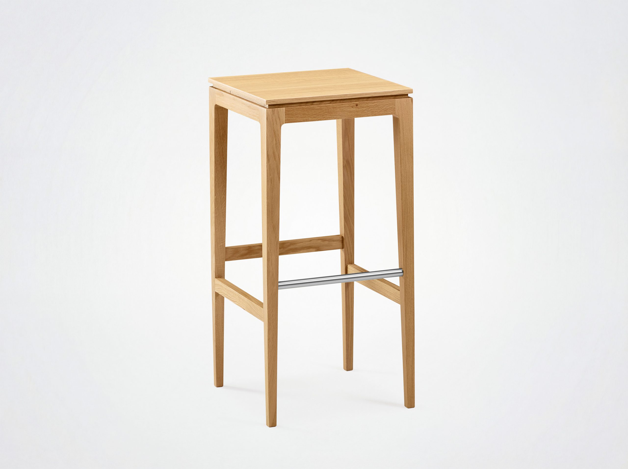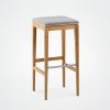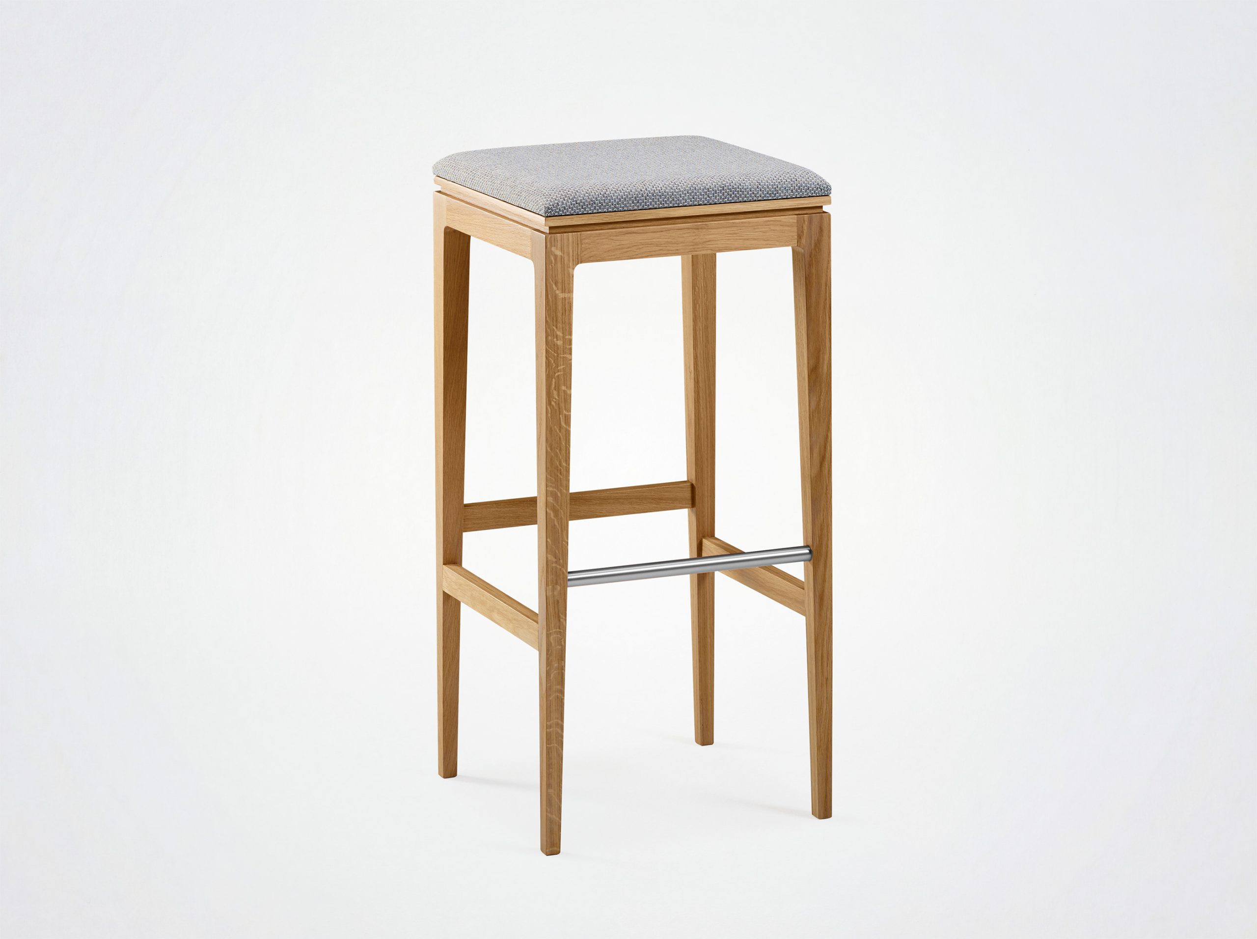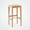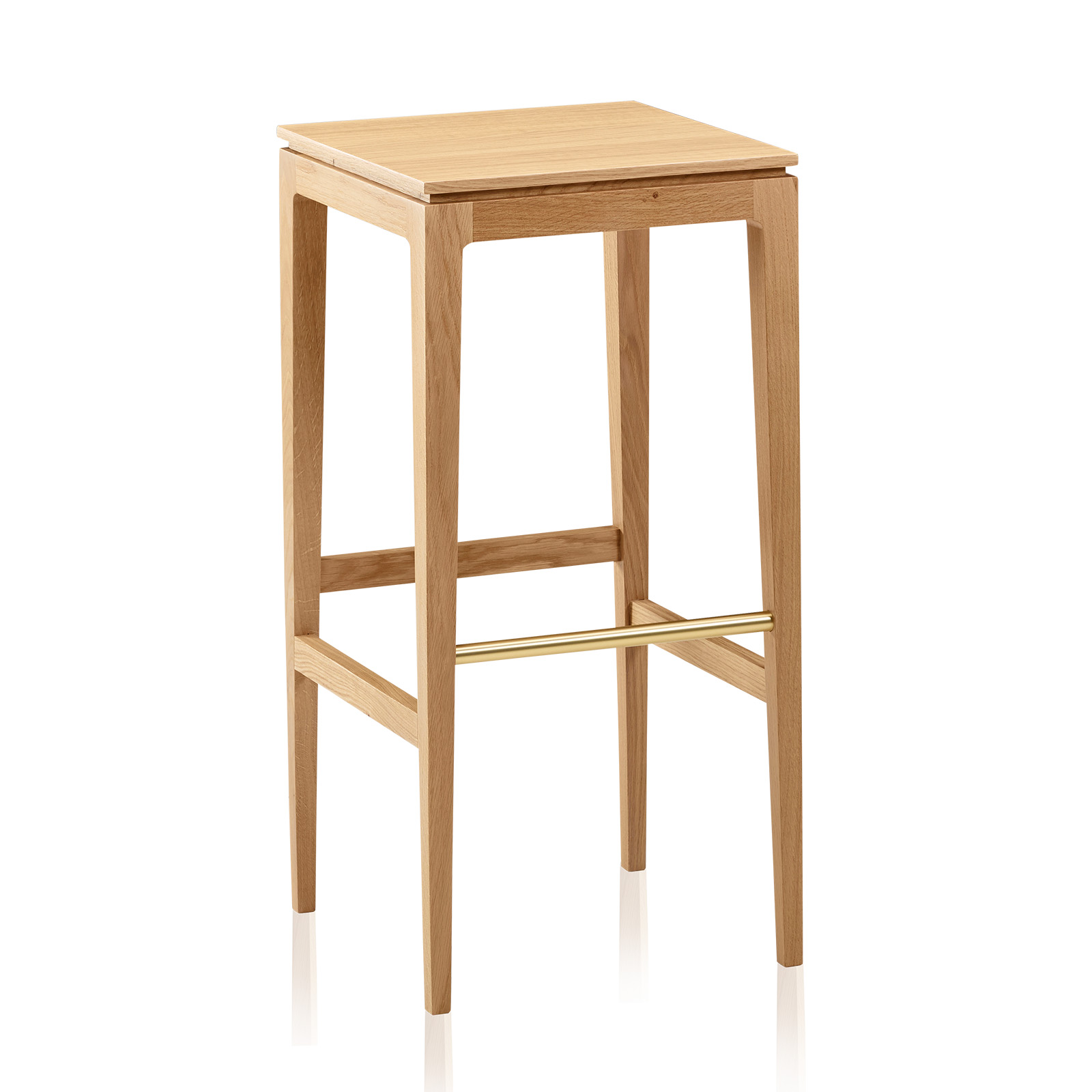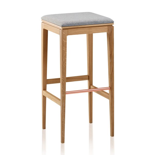 This 80 cm-high stool is available in two types of wood, with a choice of wood or quality fabric seats. It fits perfectly into a variety of spaces, whether around a bar, a kitchen island or as an occasional seat around a high table.