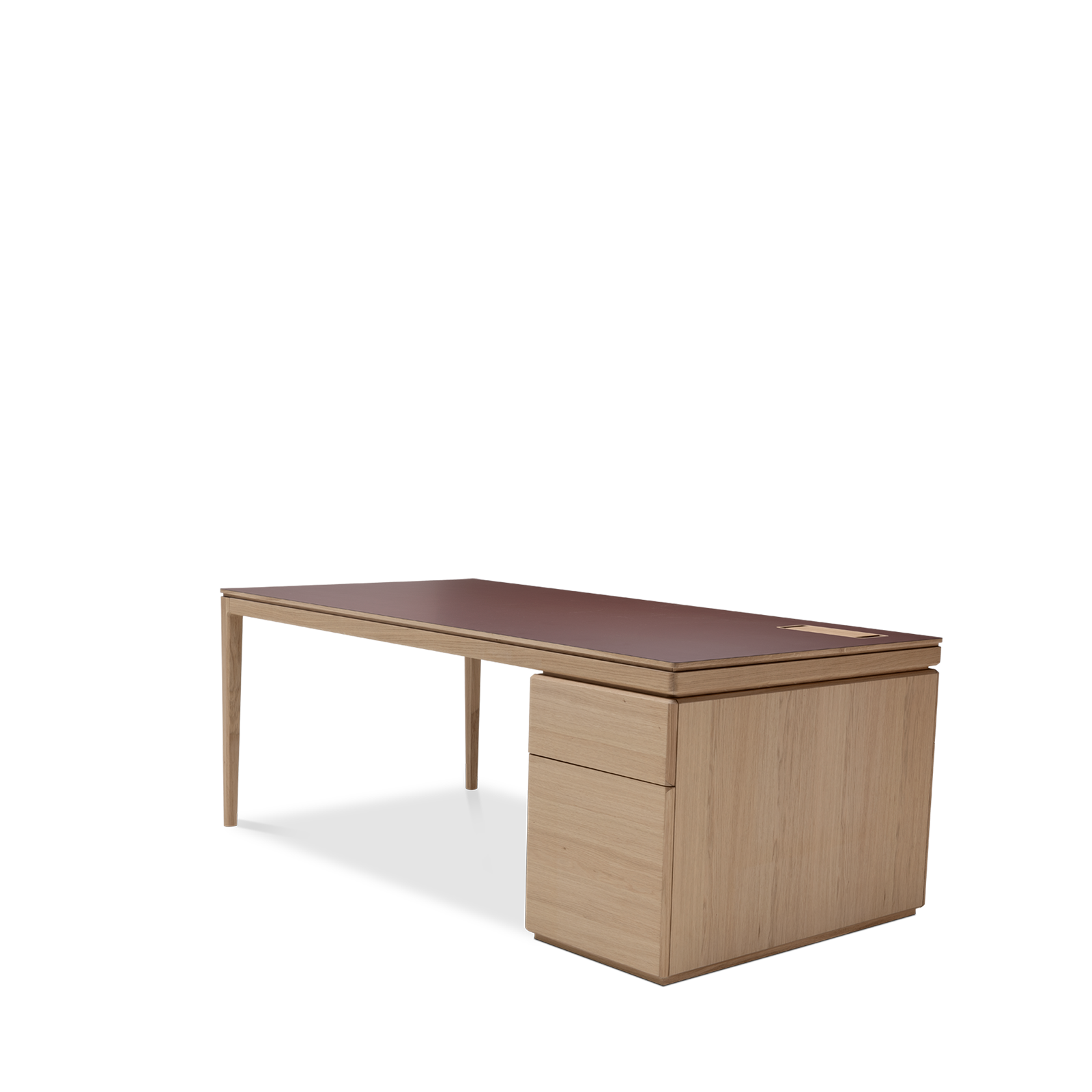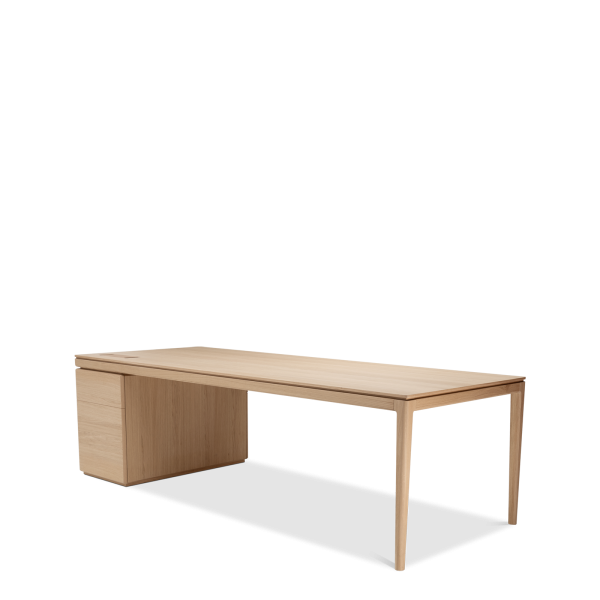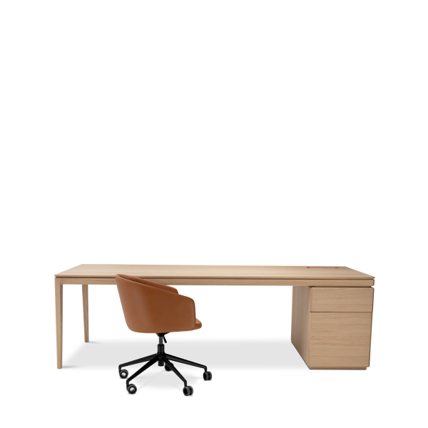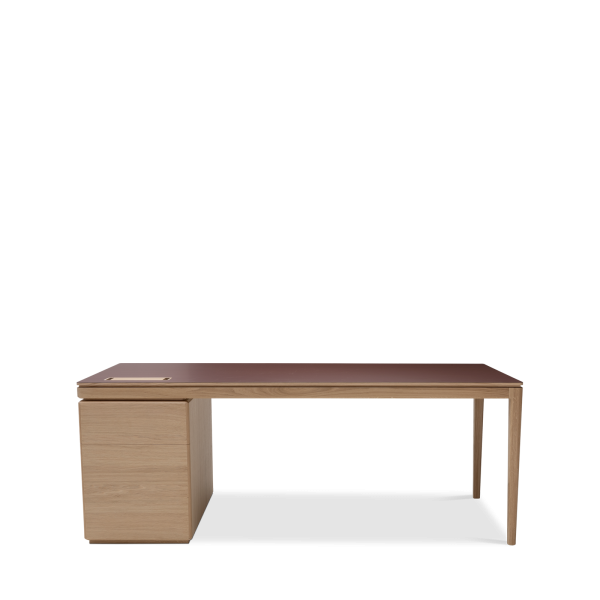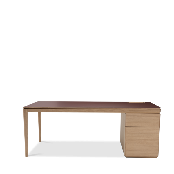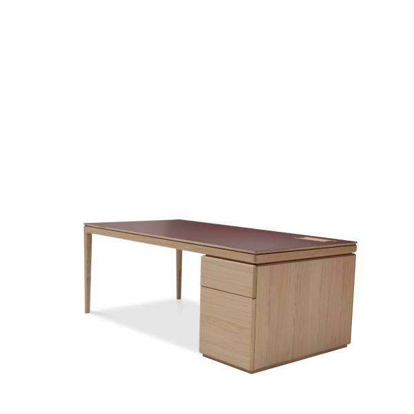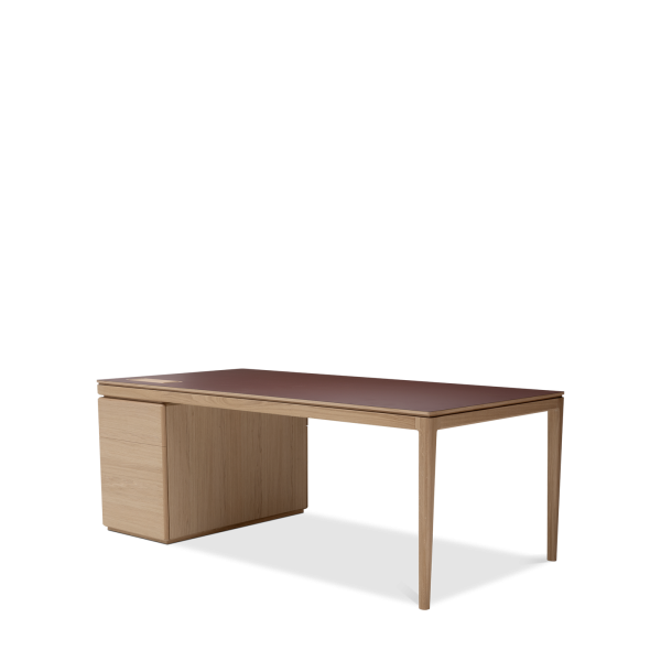 The Albâtre executive desk is a creation by Dasras Edition. Available in oak and walnut, with a top in wood, laminate or Fenix, this large, sleek desk features a two-drawer pedestal and optimized workspace.