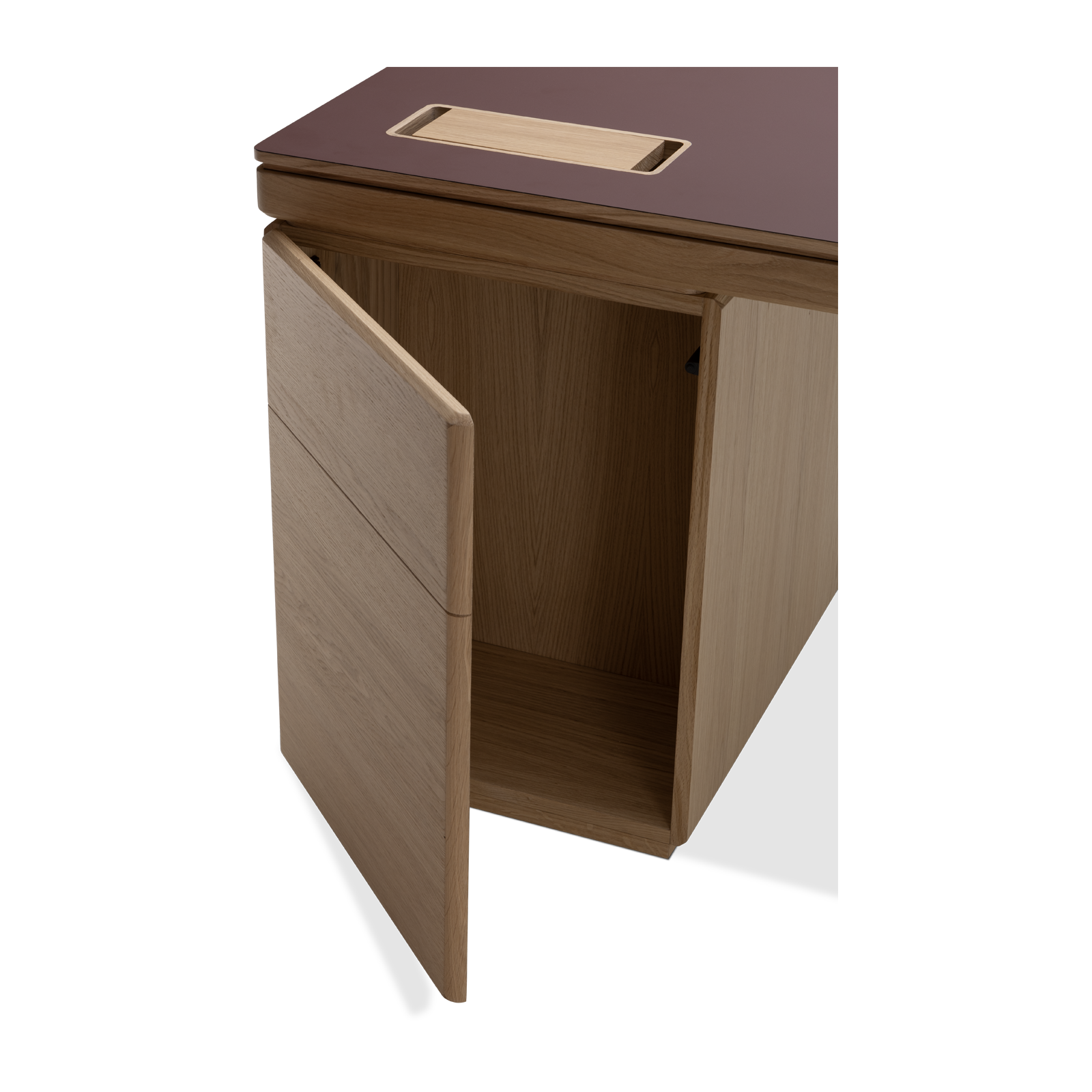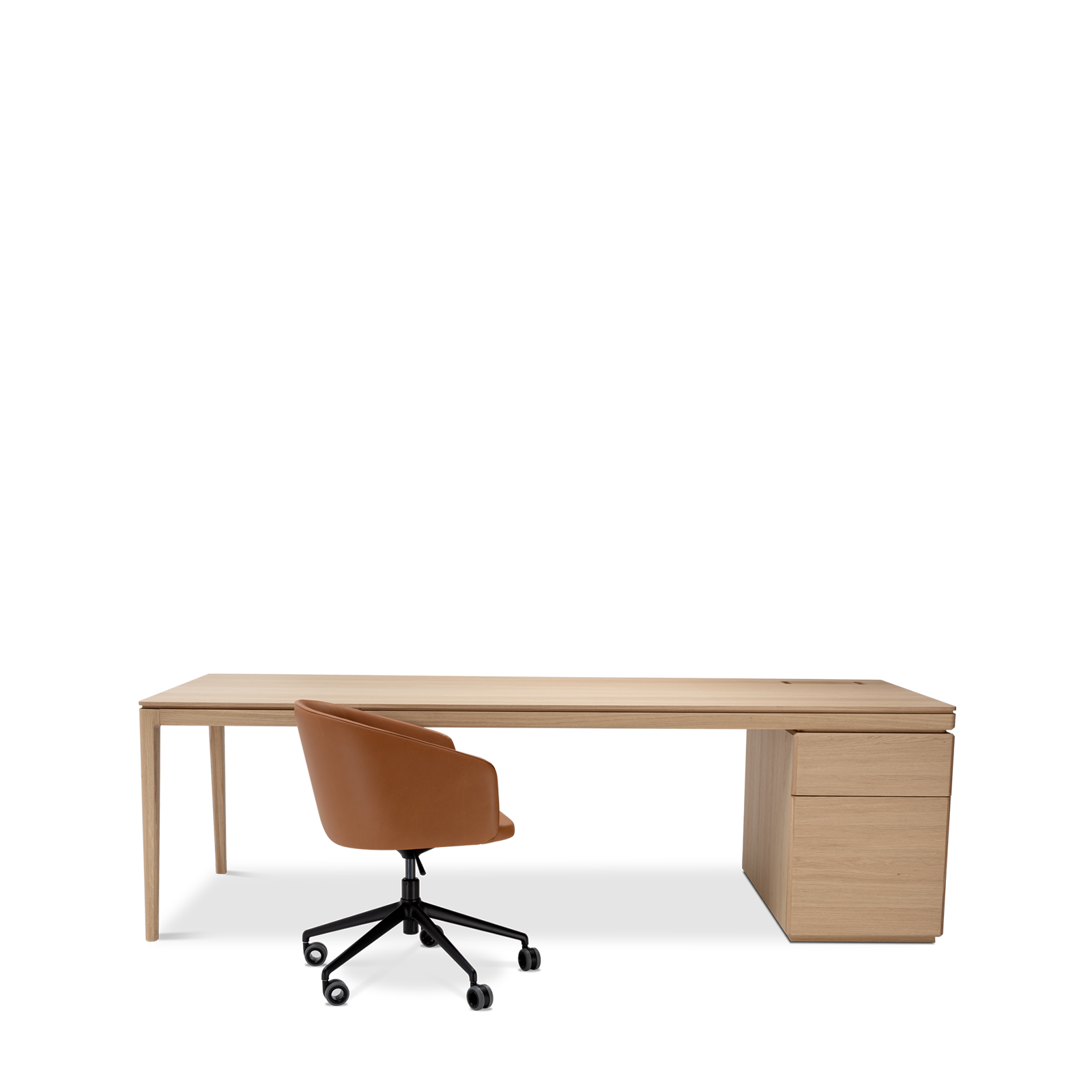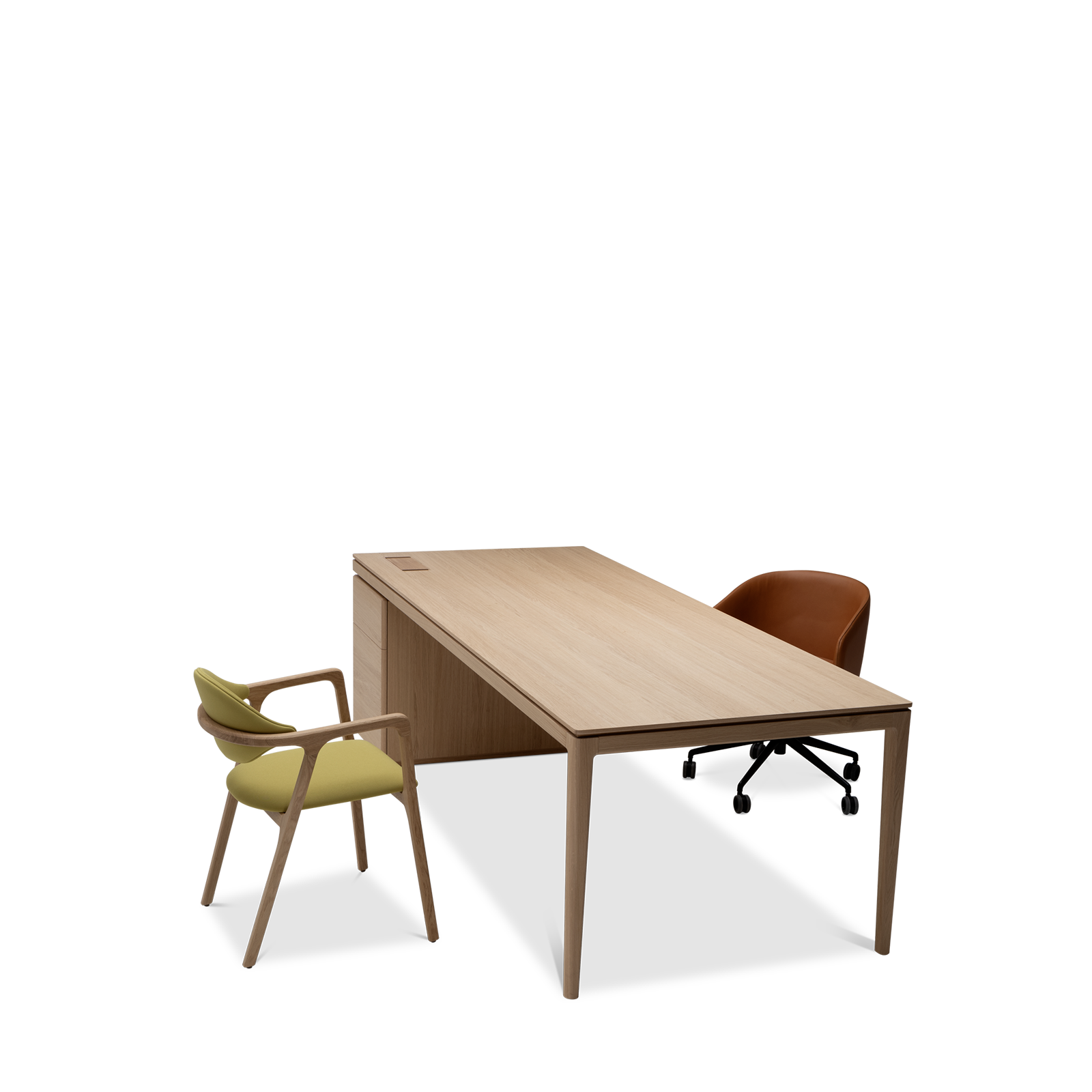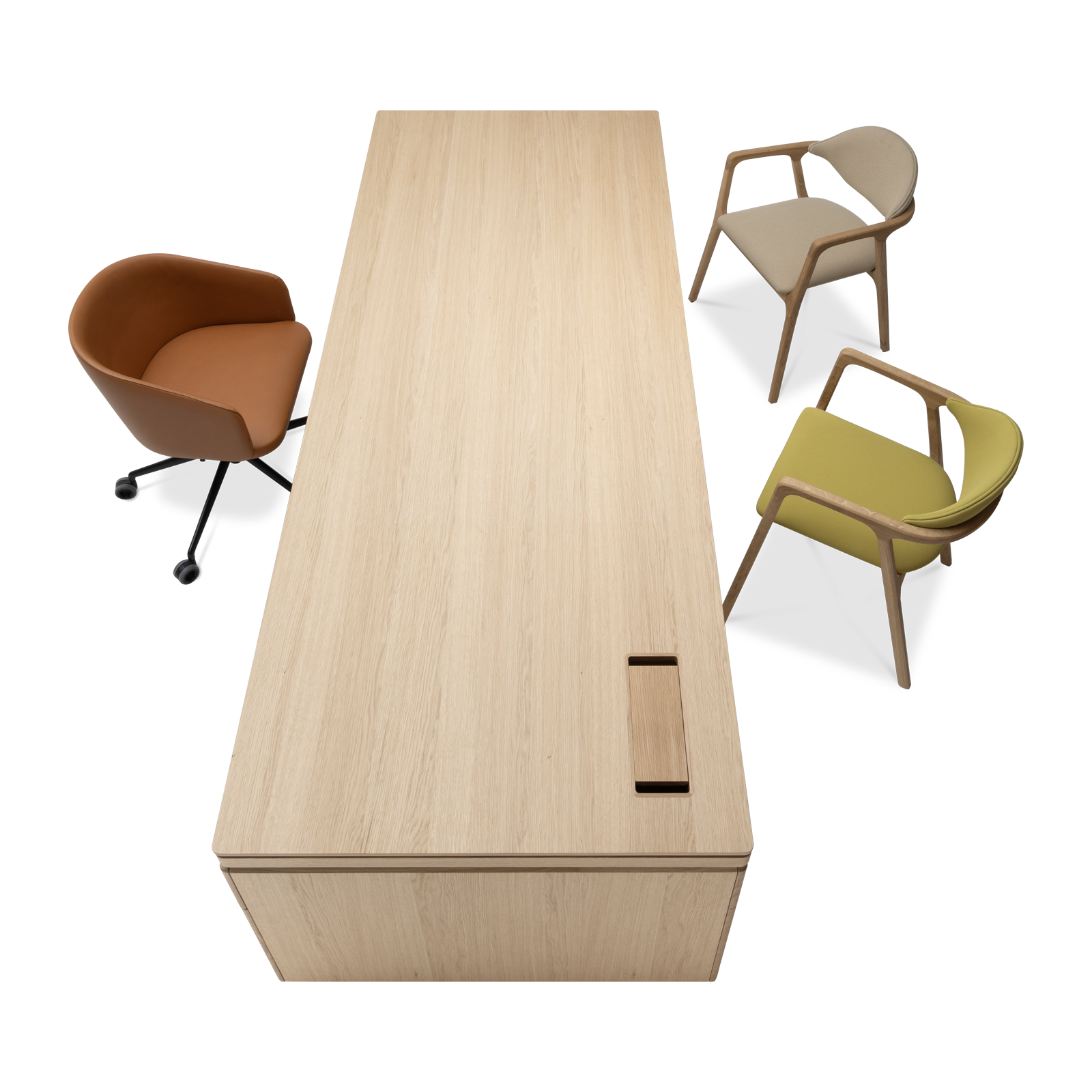 Available in oak and walnut us. Solid wood structure. Solid wood, laminate or Fenix tops Veneered pedestals and drawer fronts. Includes: 1 white lacquered metal trunking and 1 top access per station. Optionally available: additional LEGRAND top access and socket strips.