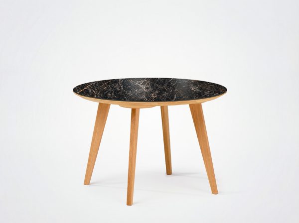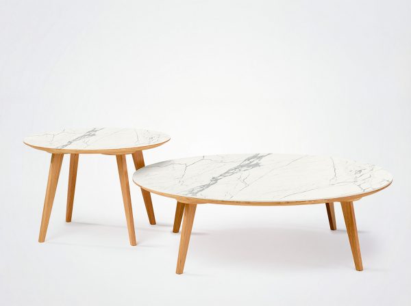 A duo consisting of a round table and an oval table with tapered legs, offering infinite possibilities for material combinations. You can opt for an all-wood table, a wood table with a ceramic top, or two all-ceramic tables in a variety of sizes.