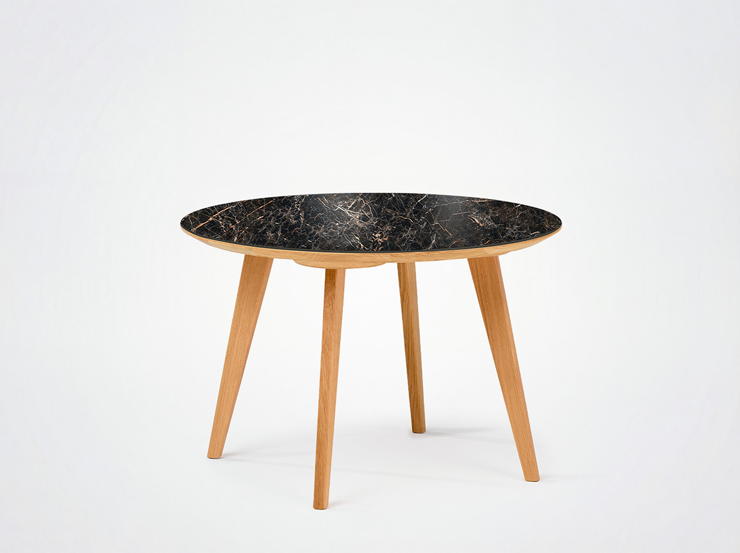 A duo consisting of a round table and an oval table with tapered legs, offering infinite possibilities for material combinations. You can opt for an all-wood table, a wood table with a ceramic top, or two all-ceramic tables in a variety of sizes.