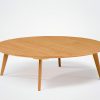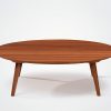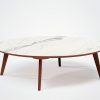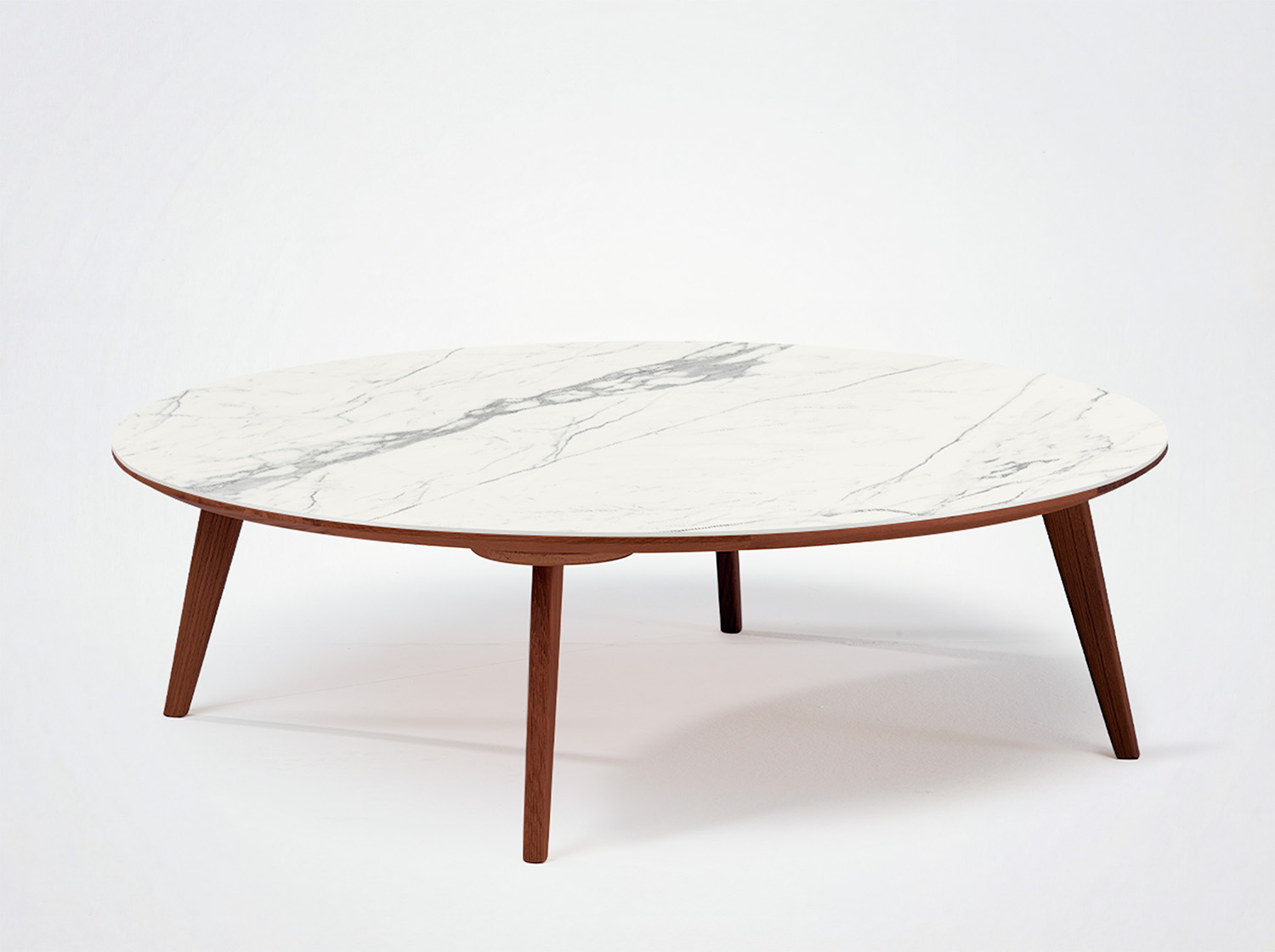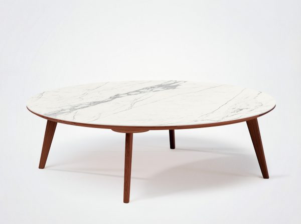 A duo consisting of a round table and an oval table with tapered legs, offering infinite possibilities for material combinations. You can opt for an all-wood table, a wood table with a ceramic top, or two all-ceramic tables in a variety of sizes.