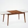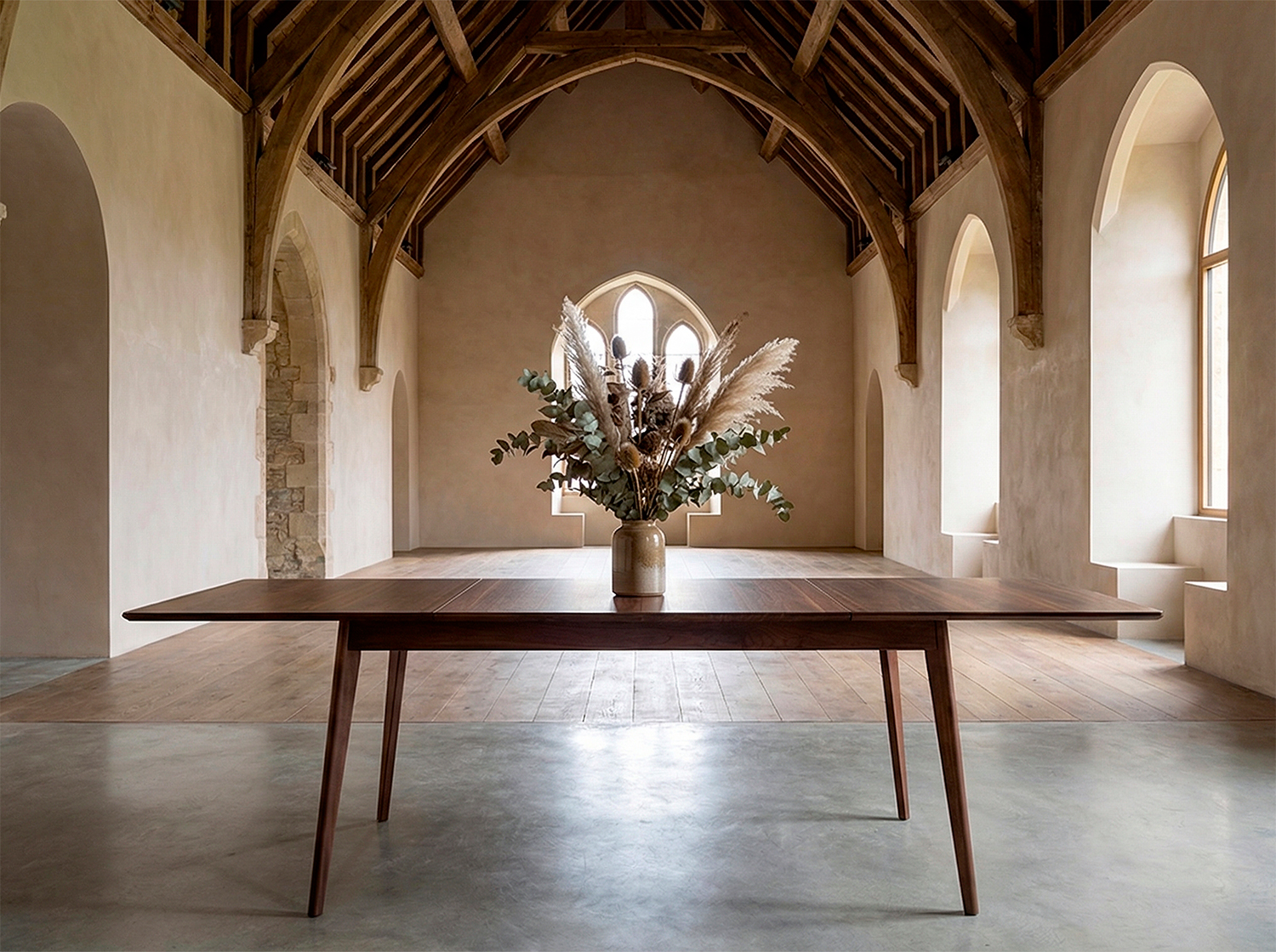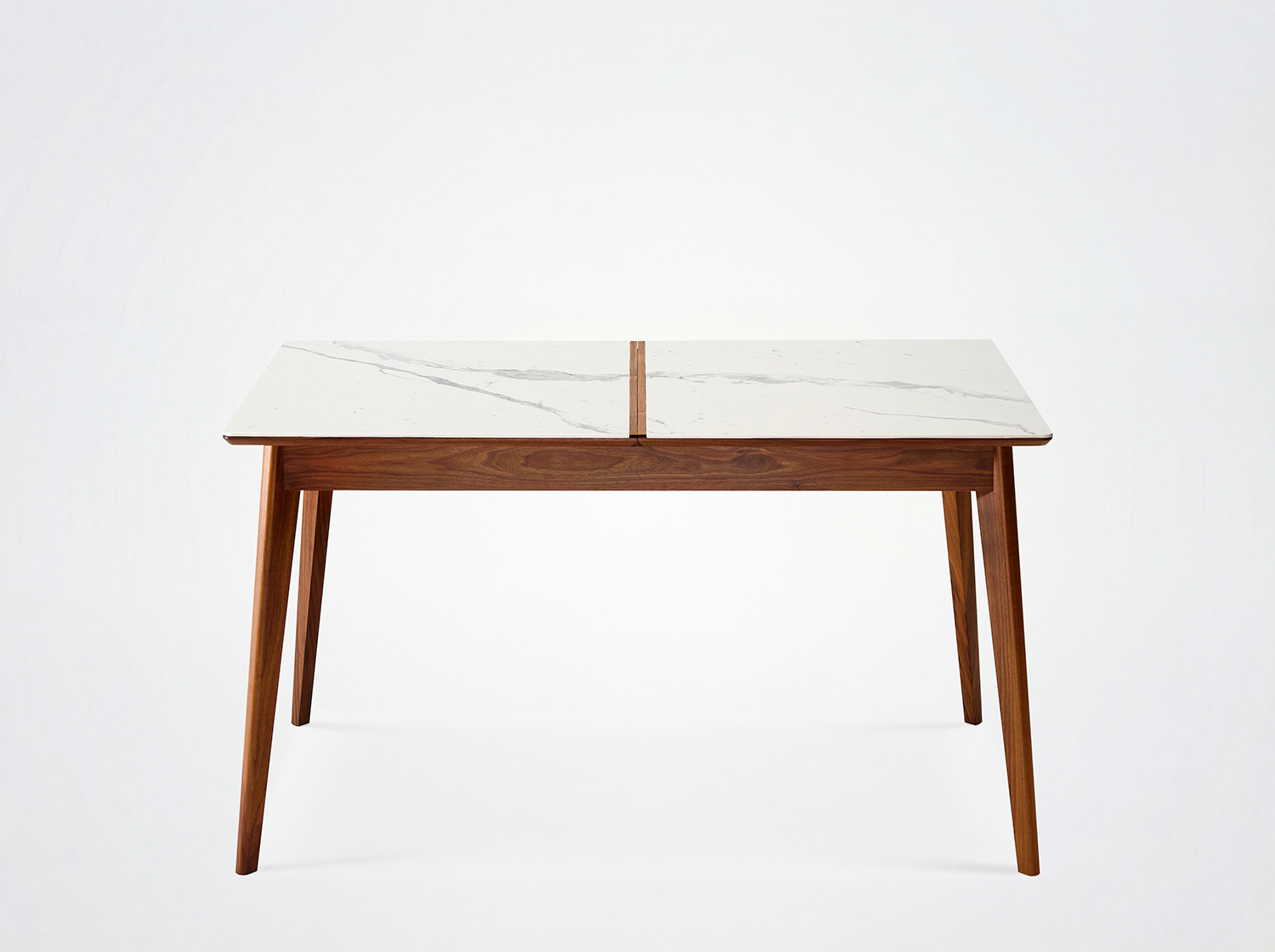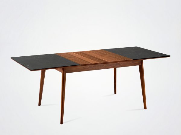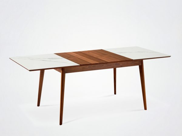 The Paul table, with its tapered legs and clean lines, offers perfect balance. Available in two types of wood, with a wood or ceramic top. Fixed or extendable, a system of aluminum runners allows you to add one or two oak (or walnut) extensions, depending on the length of the table.