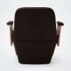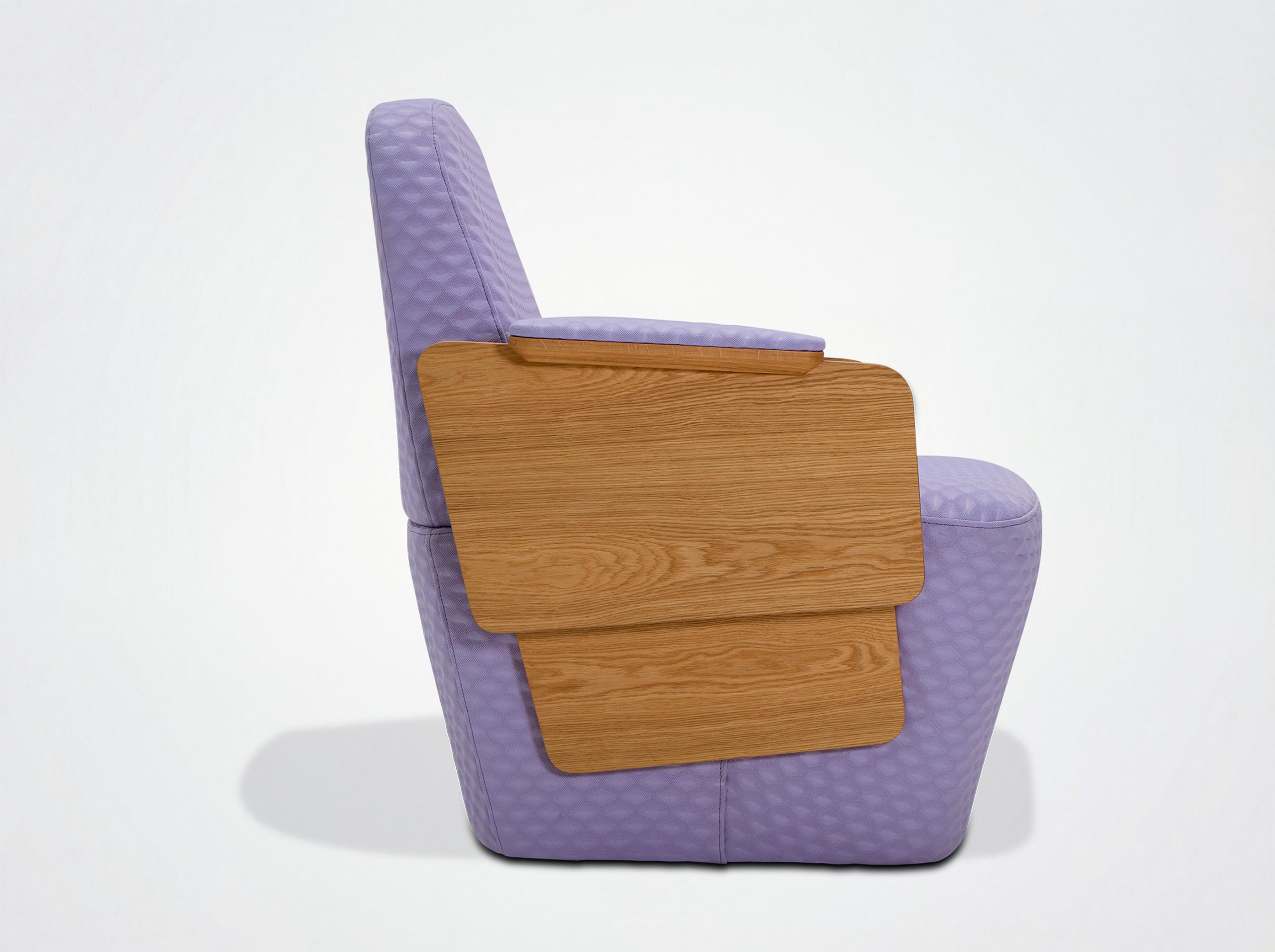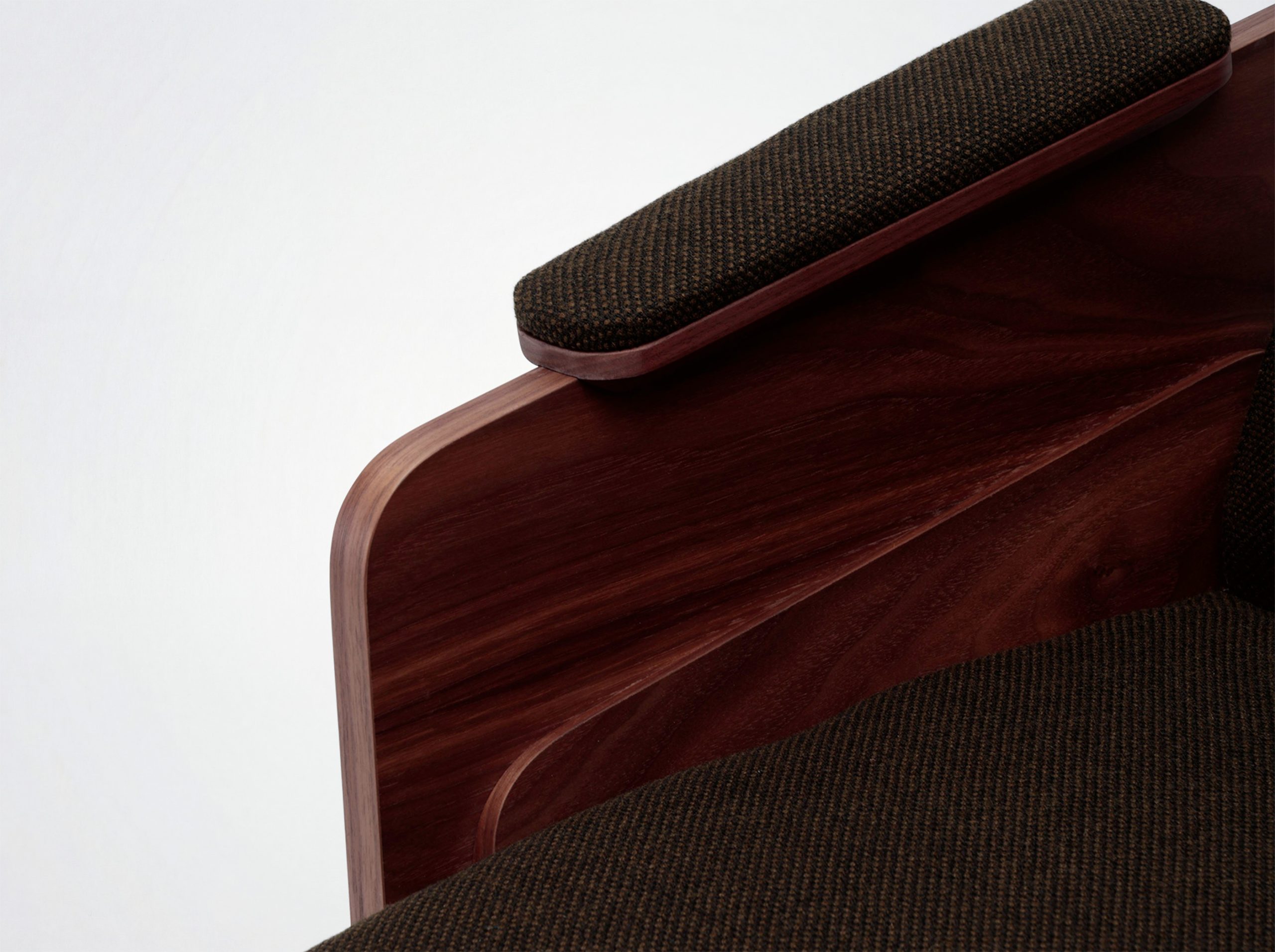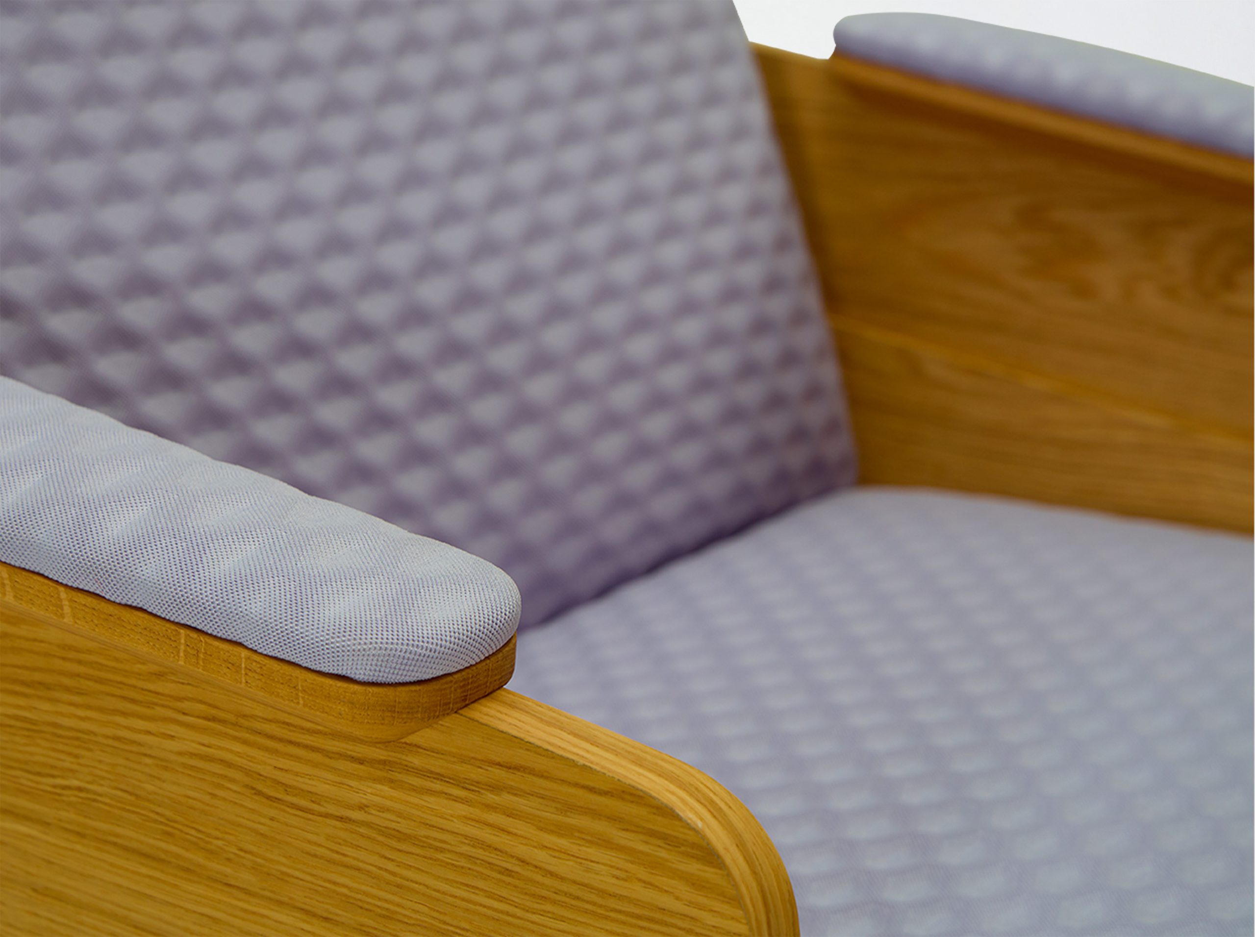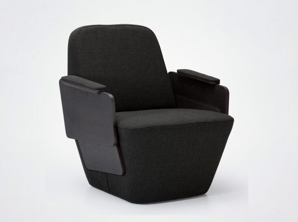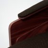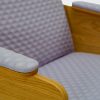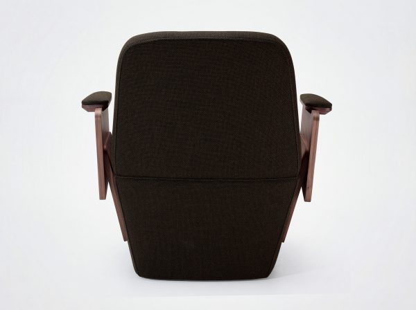 Oak or walnut veneered side panels. Foam-covered, upholstered upper armrest. Seat with straps, covered in high-resilience foam, backrest covered in foam. Bottom and back covered with 20 mm foam. Available without armrests.