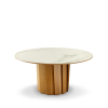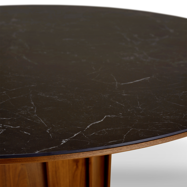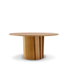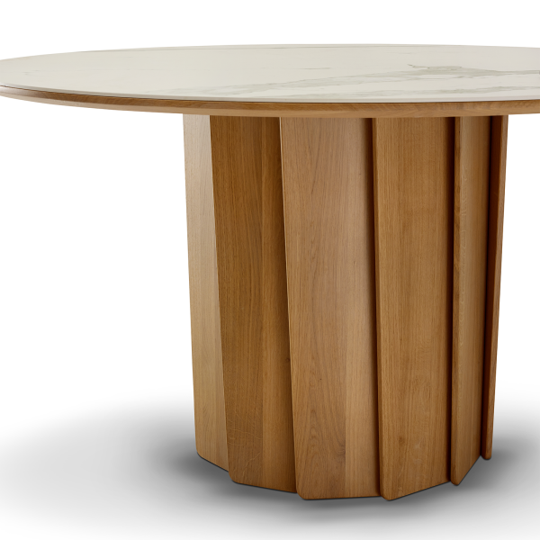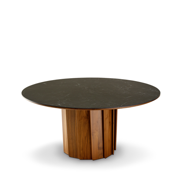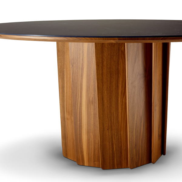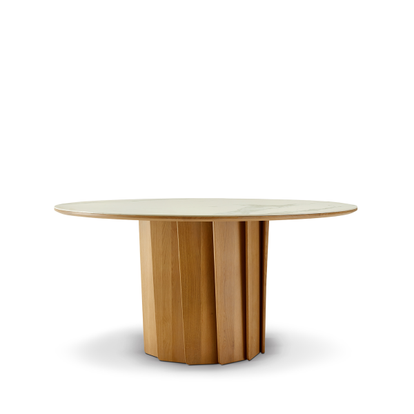 The Volute table is a powerful piece with a distinctive design: its line was imagined by French designer Pierre Dubourg, who wanted to reinterpret the bistro table, a great classic of the French spirit. It features a round top and a central leg. The base features a major technical and aesthetic innovation: it is composed of a succession of solid wood slats that create a kinetic effect by alternating light and shade.